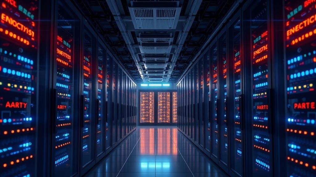 A conceptual illustration depicting the impact of AI on data centers, with glowing neural networks flowing into server racks, showing increased power demand, and a juxtaposition with a conceptual design of future low-power data farm mainboards mitigating this demand, rendered in a high-tech, illustrative style.